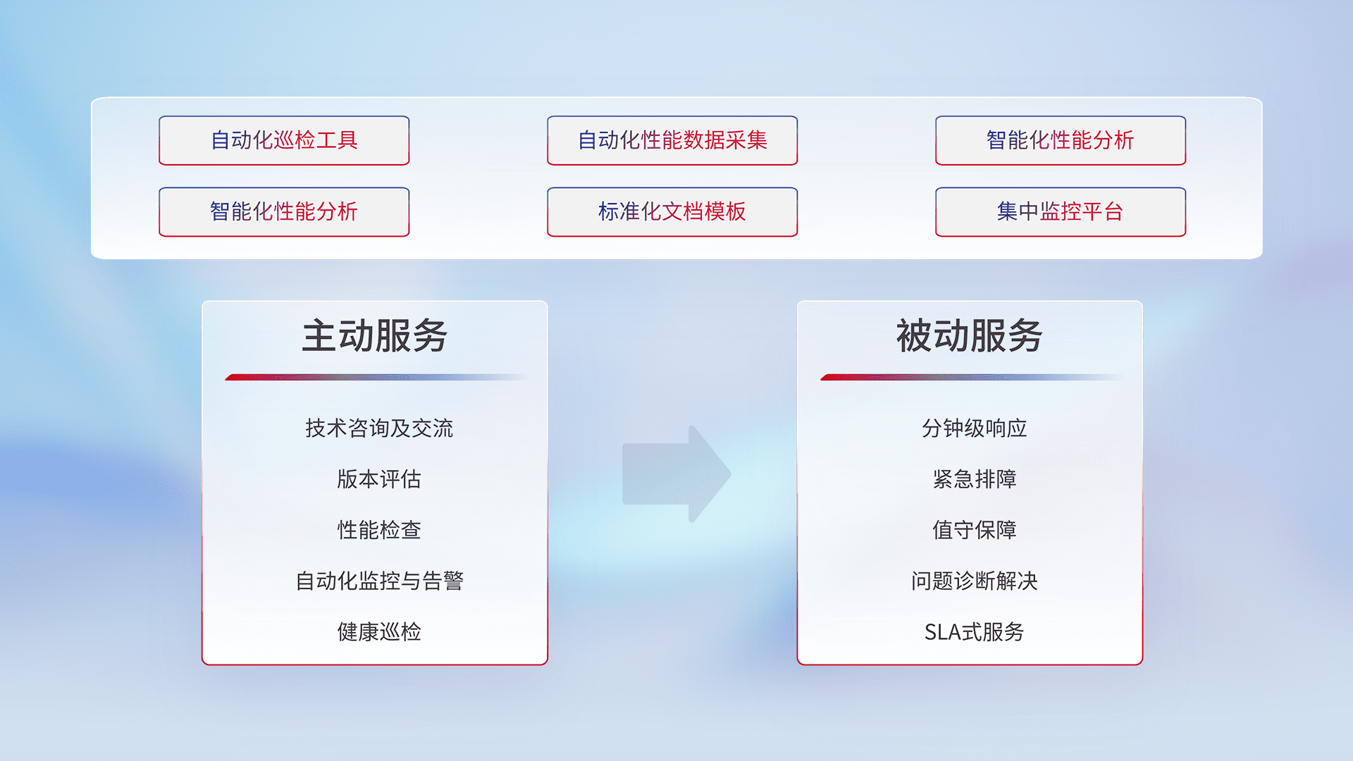 智能化工具和标准化文档,,,保障服务质量,,提供主动服务(包含技术咨询、、、版本评估、、、性能检查、、、自动化监控与告警、、健康巡检)和被动服务包含(分钟级响应、、、、紧急排障、、、、值守保障、、、、问题诊断解决、、、SLA服务)。。