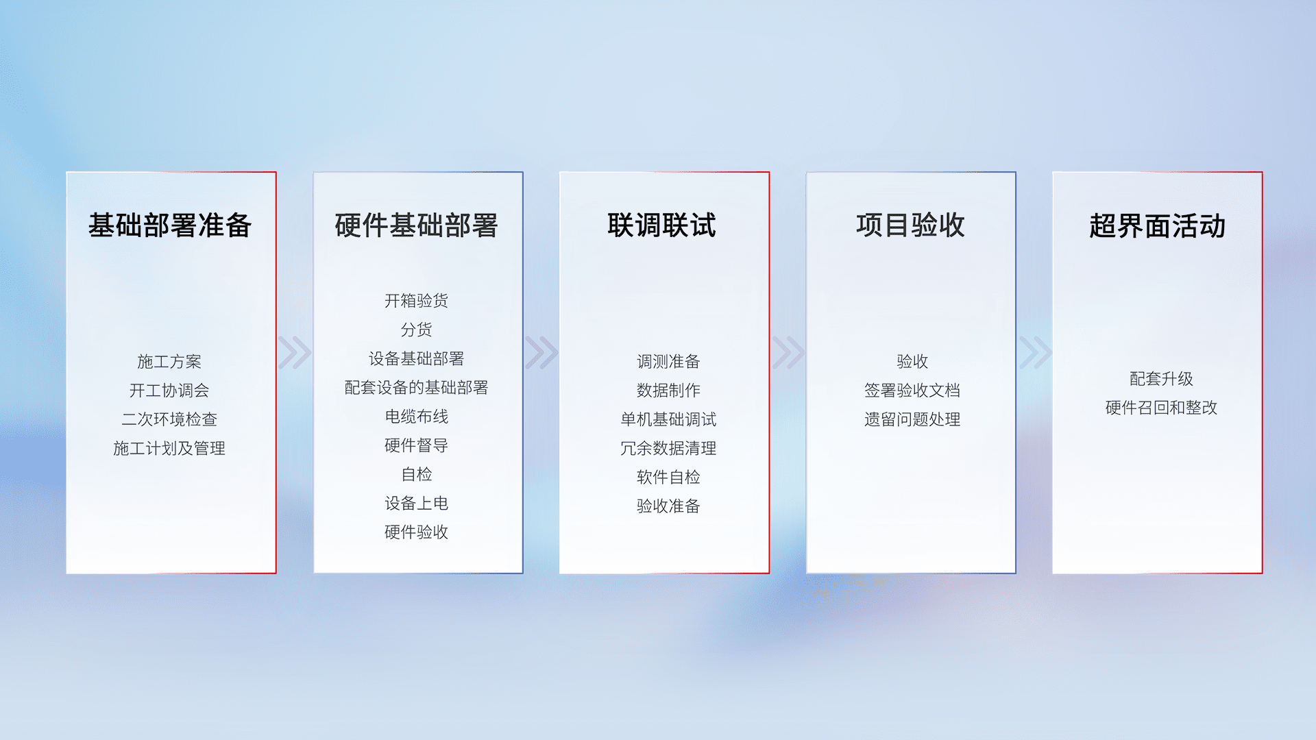从基础部署准备、、硬件基础部署、、、、联调联试、、项目验收、、、越界面活动的全过程可追溯,,,,保证施工质量和进度。。。。